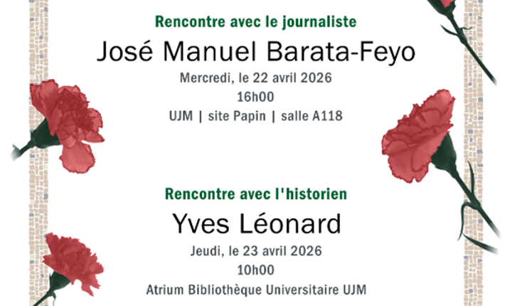 Dans un premier moment, nous aurons une rencontre avec José Manuel Barata-Feyo le mercredi 22 avril 2026, à 16h00, dans la salle A118 du site Papin de l’UJM. Le jeudi 23 avril, à 10h, une rencontre avec Yves Léonard aura lieu dans l’Atrium de la Bibliothèque Universitaire de l'UJM pour la présentation de son dernier livre « Otelo, La voix de la révolution des Œillets »